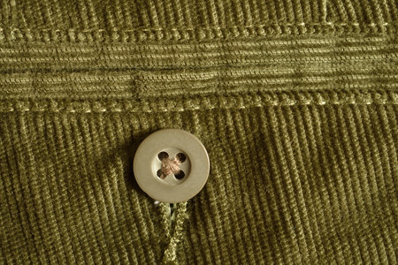 A detailed close-up of brown corduroy fabric featuring a vintage button, perfect for textile design projects and fashion illustrations.