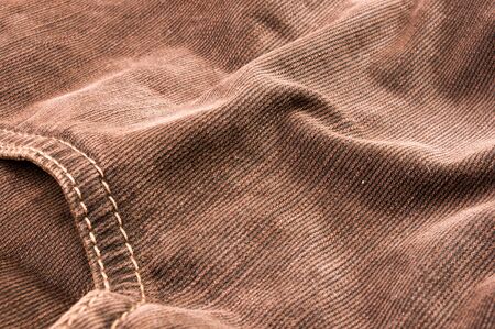 Texture backdrop of beige colored corduroy fabric cloth with pocket . Corduroy retro fabric background or texture. Close up view