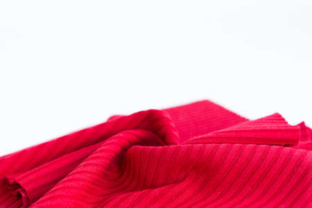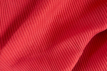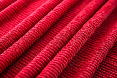 A close-up shot of red corduroy fabric with diagonal stripes, highlighting its textured surface and soft appearance.
