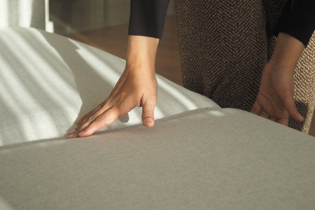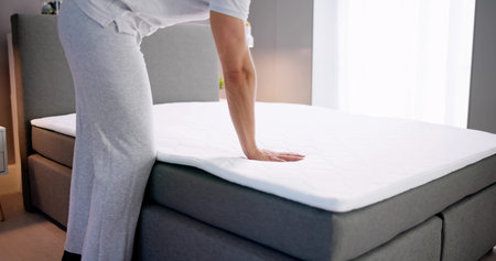 health care concept. Woman inspecting new bed topper on sleeping mattress. Female hand pressing on polyurethane material, checking best quality of product for sleeping healthy at home