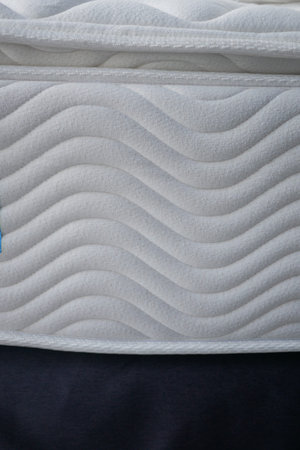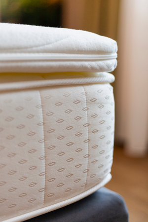 A close-up view of a newly designed mattress showcasing its soft fabric and plush texture. The mattress is placed indoors, contributing to a cozy atmosphere in the space