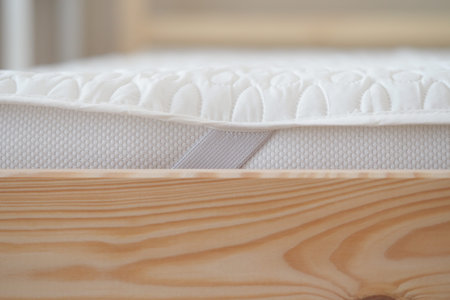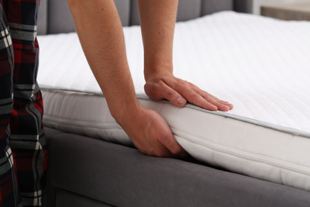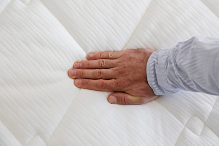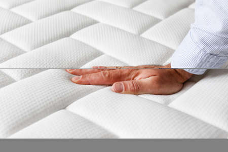 Cropped shot of man testing the firmness of white orthopedic mattress. Male pressing hypoallergenic foam mattresses surface to check its softness. Close up, copy space, top view, background.