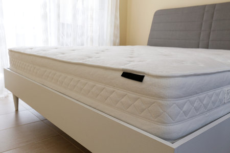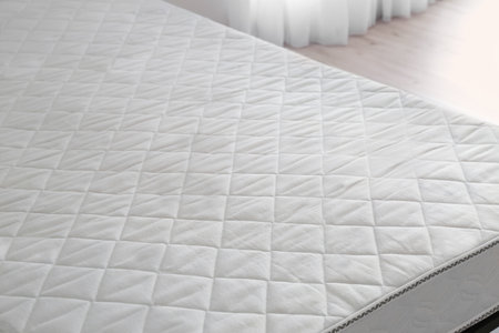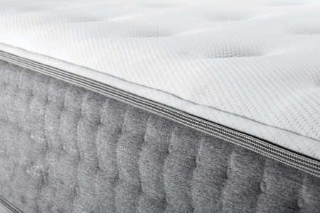 Close up shot of a white orthopedic mattress top side surface pattern on top of the bed. Hypoallergenic foam matress for proper spinal alingment and pressure point relief. Background, copy space.