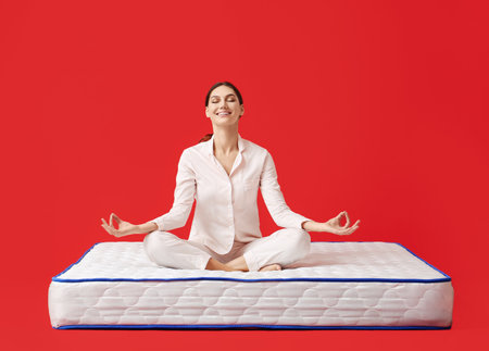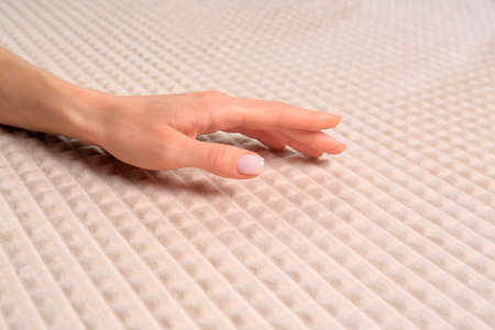 Flat lay of woman hand pressing on white orthopedic mattress with memory foam. Female checking hardness and softness. Choice of the best type and quality
