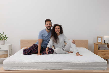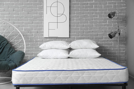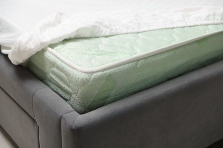 White orthopedic mattress top side surface pattern on unmade bed in the bedroom. Hypoallergenic foam matress for proper spinal alingment and pressure point relief. Background, copy space, close up.