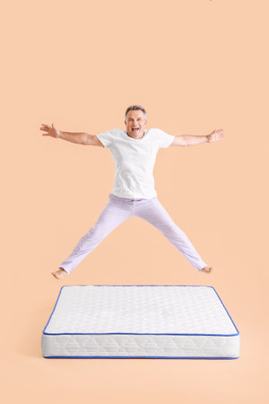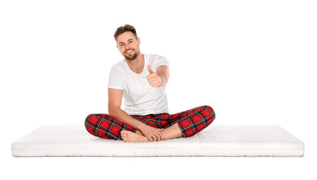 Smiling man sitting on soft mattress and showing thumb up against white background