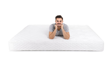 Young guy sitting on the floor and leaning against a bed mattress isolated on white background