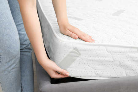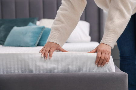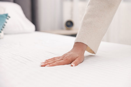 Cropped shot of woman hand testing new orthopedic memory foam core mattress at comfortable bed at home. Female customer choosing equipment for healthy sleeping
