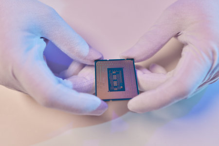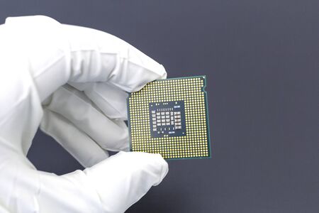 Hand in white glove holding a CPU computer processor microchip.Background is dark grey color.