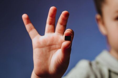 A girl holds in her hand and examines a small black chip. Chipization of people after an epidemic coronavirus.