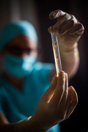 Conceptual photograph of a doctor's hands holding and looking at a test tube while with positive samples for the presence of coronavirus (COVID-19).