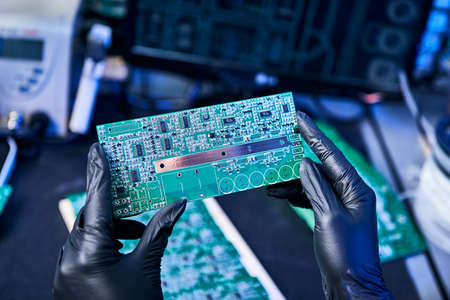 Close-up of male hands holding microchip. Man in special uniform making diagnostics of computer part. Worker checking pc microcircuit. Electronics and technique concept