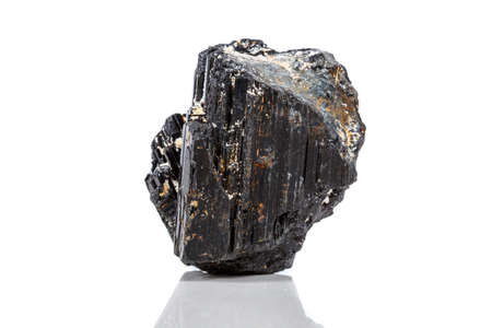 macro mineral stone sherle, schorl, black tourmaline on white background close-up