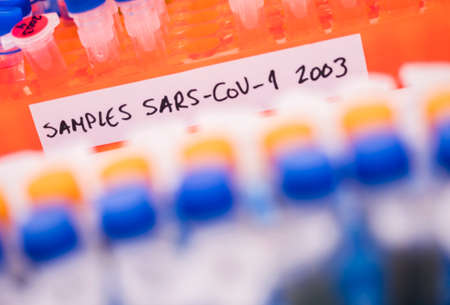 Vials with samples of SARS-COV-1 prepared cold in a laboratory, epiedomological study on Sars-CoV-2 Covid-19, conceptual image