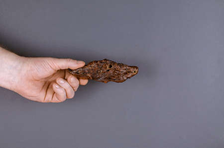 Hand with with dog treats on gray background. The man is holding a piece of dried beef lung. Natural chew treats for pets. Pet supplies. Side view.