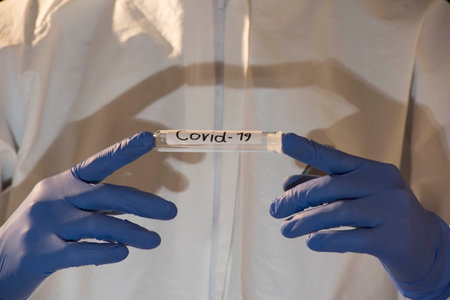 Doctor hand in rubber medical glove holding a test tube with Covid-19 test label.
