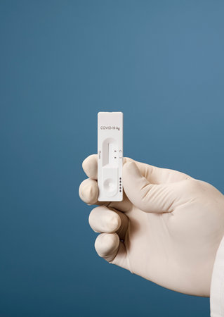 Doctor in protective vinyl gloves holding Covid 19 Ag test.
