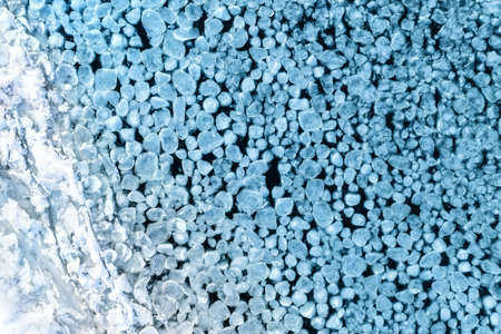 Abstract texture of broken white ice in blue water near a snowy shore. View of the ice from a drone. Background from the frozen surface of a clean lake or river.