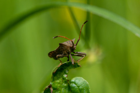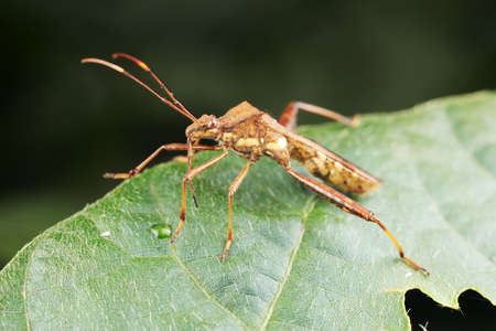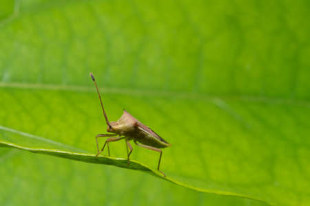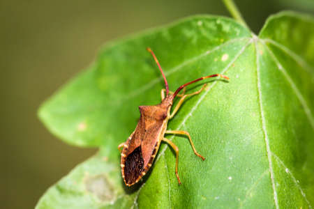a young brown bedbug sorrel edge (Coreus marginatus) sits on a green leaf