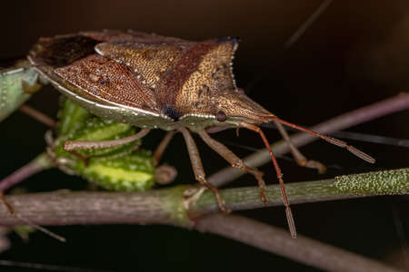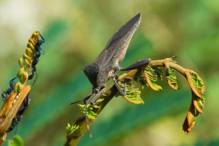 Image of Groundnut Bug, Acanthocoris sordidus (Coreidae) on branch on natural background. Insect. Animal.