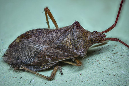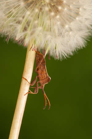 Coreus marginatus the dock bug insect that looks like made of wood in mimetic brown color perched on plants on unfocused green background light by flash
