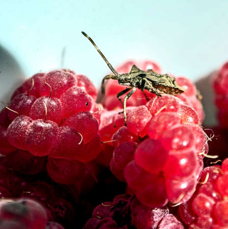 garden bug on red ripe raspberries, macro