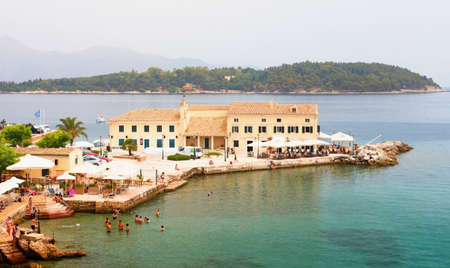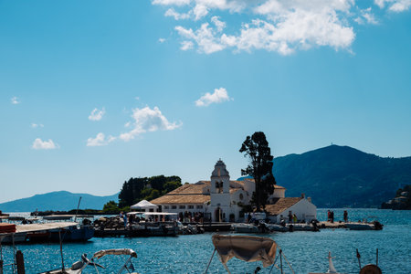 Kerkyra, Greece - 09 24 2022: The holy monastery of Panagia Vlacherna, a tourist place on the island of Corfu.