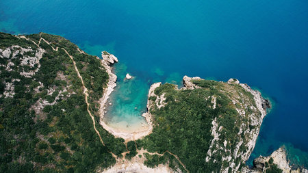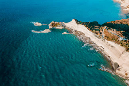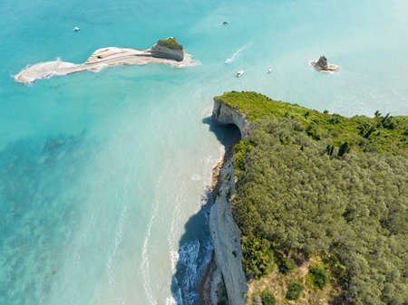 Aerial view of the cliff overlooking the sea near Apotripiti beach and of Mermaid's rock, a promontory on the crystal clear sea. Corfu island, Greece, Ionian sea.