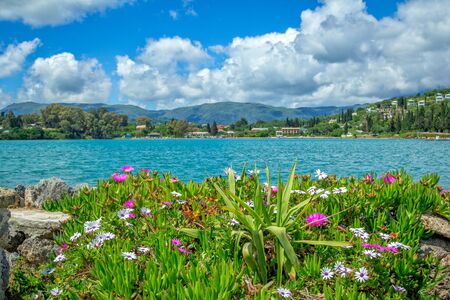 Beautiful landscape – sea lagoon with turquoise water, colorful flowers and green grass, blue sky and hills on the horizon. Corfu Island, Greece.