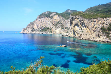 Seascape - lagoon with turquoise water, mountain with cliffs, green trees, bushes, rocks in a blue water and fishers boats. Corfu Island, Greece.