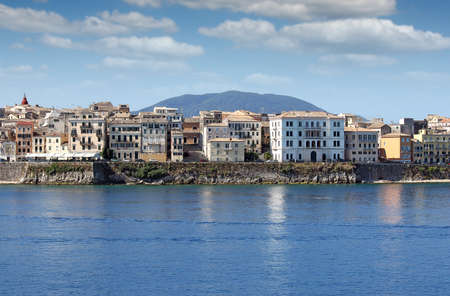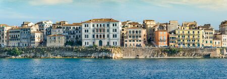 Panorama of Corfu town from the sea. Old town buildings of Kerkyra island