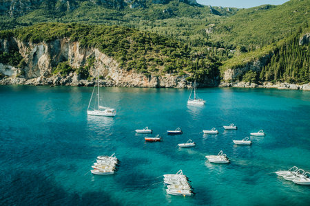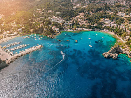 Aerial view of Paleokastritsa bay on a sunny day. Bay with beautiful turquoise water and boats.