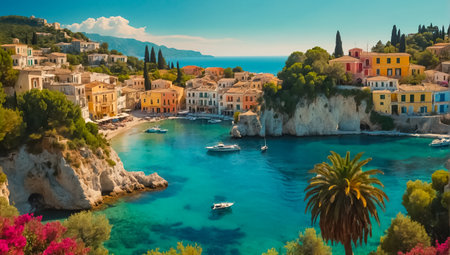 Breathtaking aerial panoramic view of a beautiful Mediterranean bay in Greece. A picturesque coastal village and a sunny beach with tour boats docked on the crystal clear turquoise sea