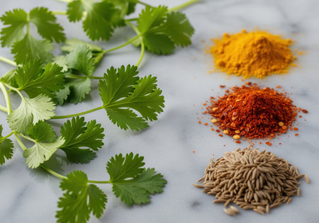 Fresh cilantro sprigs arranged alongside three distinct piles of colorful spices, bright yellow turmeric powder, vibrant red chili flakes, and brown cumin seeds, resting on a cool marble countertop.