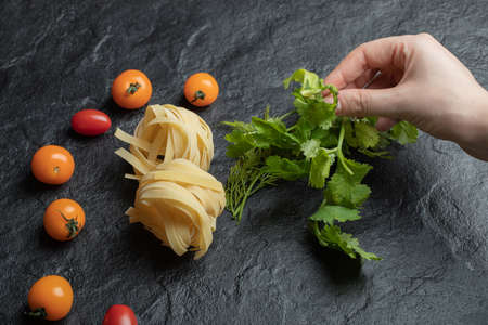 Hand holding greens and raw nest pasta on a dark background