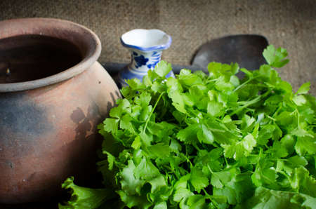 Fresh Lettuce with Clay pots and ceramic vase on brown sack