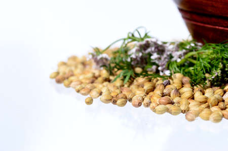 Coriander seeds with fresh leaves isolated on white background.