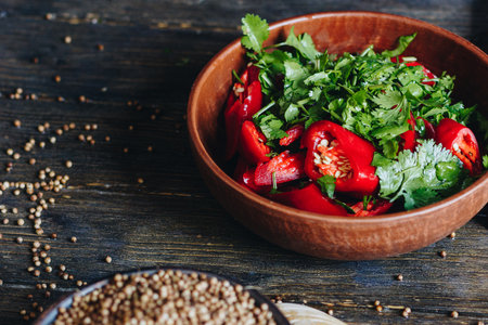 Chopped red hot chili peppers and parsley in a bowl