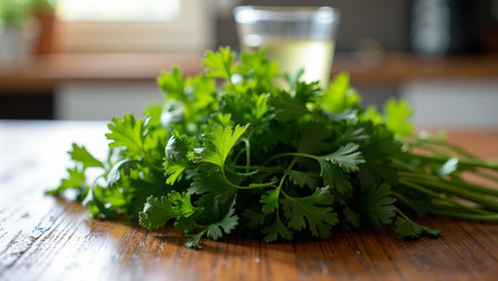 Fresh cilantro on a rustic wooden board. Vibrant green leaves emphasize the organic and healthy food concept. Ideal for cooking, diet, and farm-to-table themes