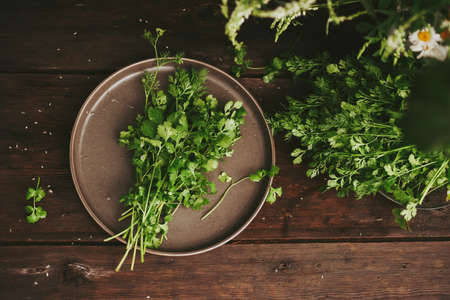 A bunch of cilantro, fresh coriander on a wooden dark table. fresh greens Rustic style. Authentic still life. Flat lay