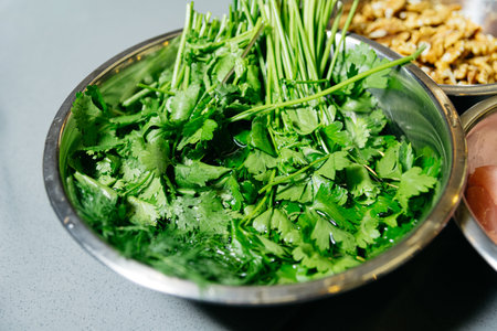 Green herbs like parsley and cilantro being washed in a metal bowl, prepared for use in cooking or salad preparation.