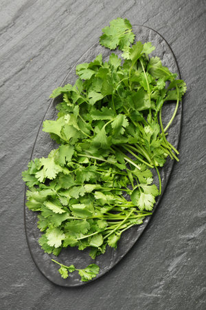 Fresh coriander on dark gray textured table, top view
