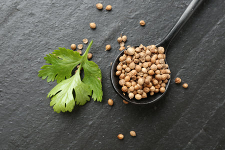 Coriander seeds on grey background with copy space.