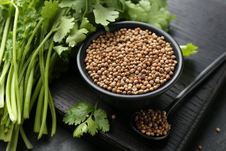 Coriander seeds in bowl, spoon and fresh cilantro leaves on dark textured table, closeup