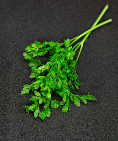 Green tops of parsley on dark background