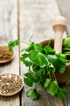 coriander on a dark wood background. tinting. selective focus