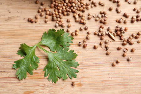 A bunch of fresh coriander and dried coriander on the table. Spices. Copy space.