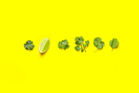 Fresh coriander leaves on yellow background.