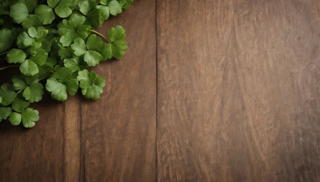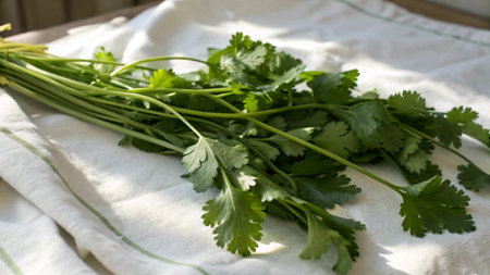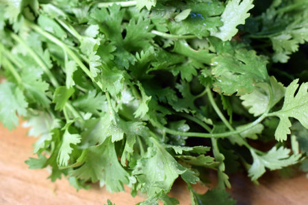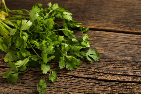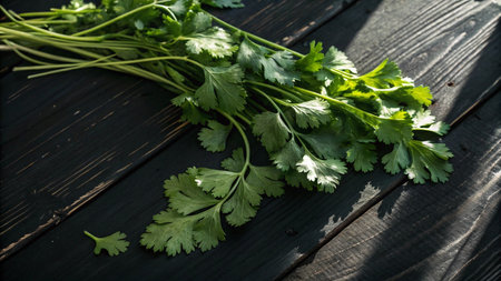 Fresh cilantro on a rustic wooden board. Vibrant green leaves emphasize the organic and healthy food concept. Ideal for cooking, diet, and farm-to-table themes
