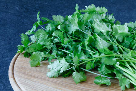 Fresh organic coriander herb on vintage wooden cutting board with copy space